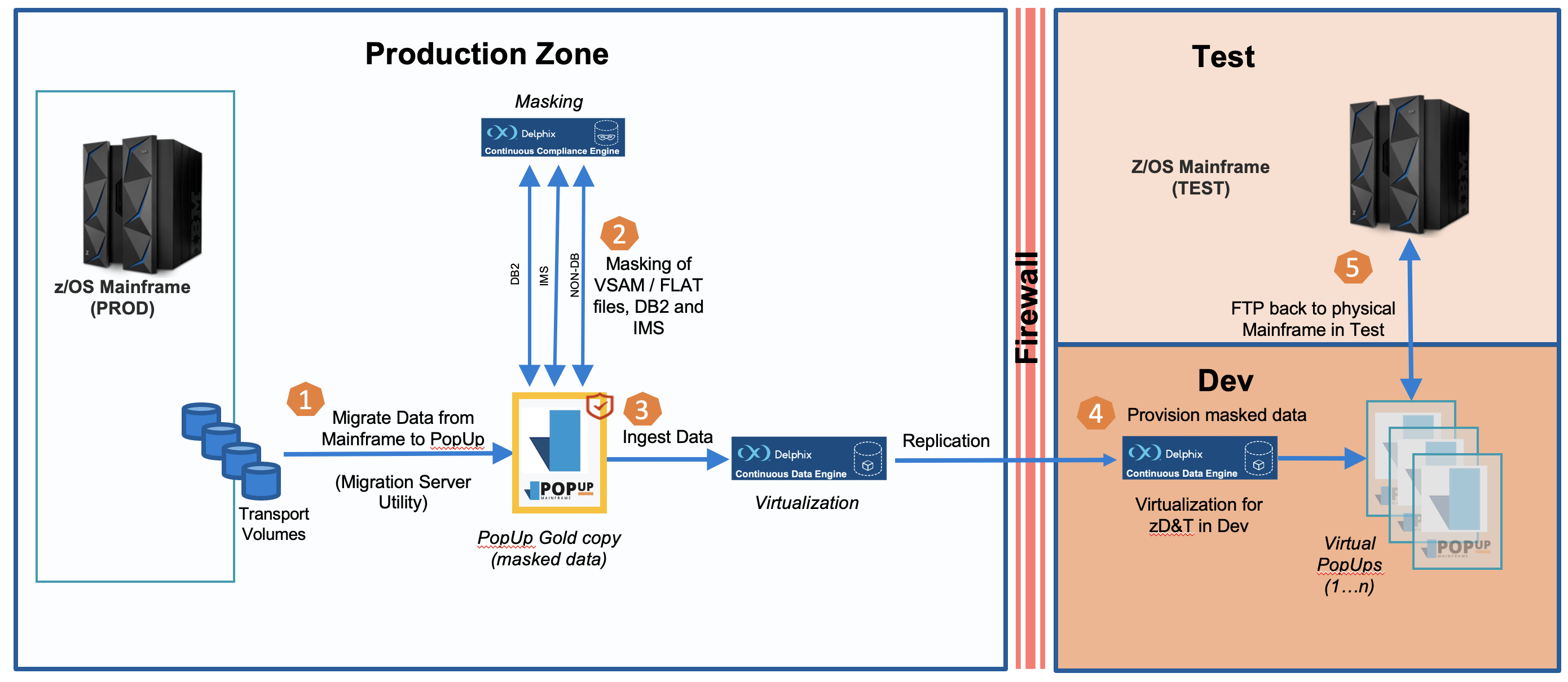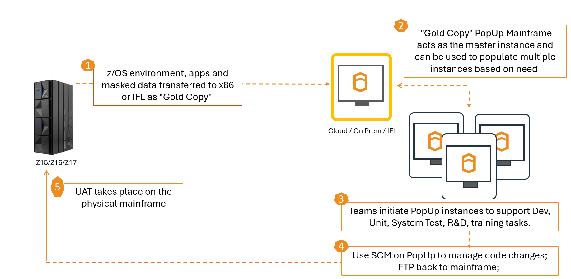 - Data and applications are migrated from the physical mainframe to the PopUp, to build a "Gold copy PopUp". This gold copy would typically be sanitized by masking data.